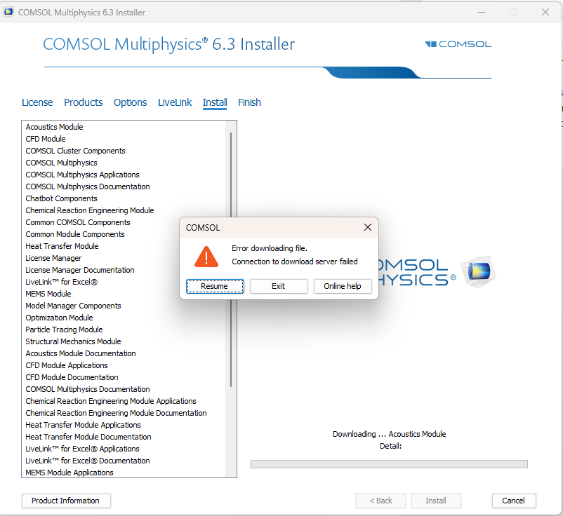 When I am installing COMSOL Multiphysics 6.3, I face these kinds of error: for reference I am attaching the screenshoot of an error.