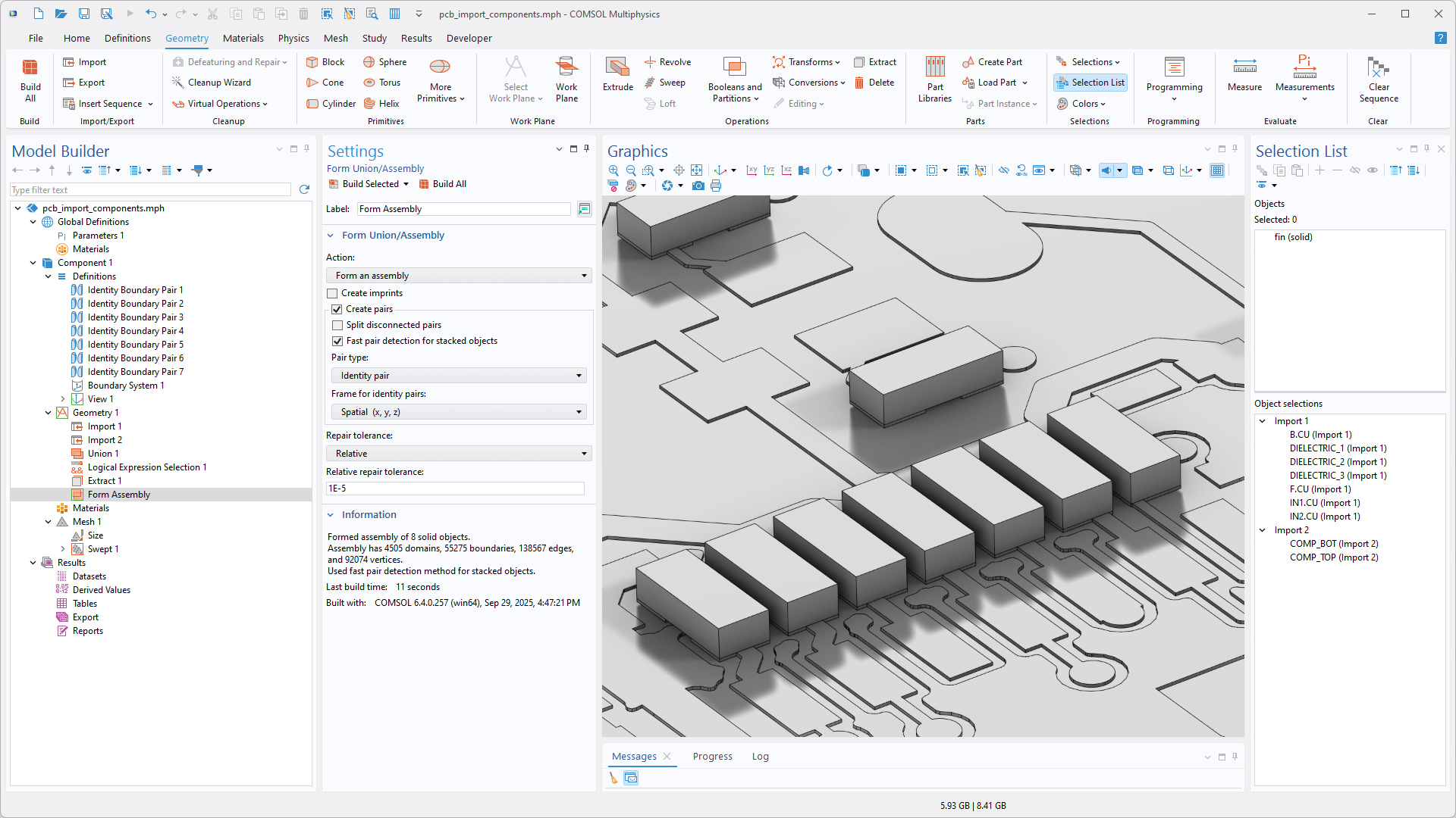 The boundary pair generation for stacked extruded objects is now significantly faster when using the Form an assembly finalization method. This improvement is especially useful for layered PCBs and MEMS devices, but it is applicable to any geometry containing extruded objects stacked in the z-direction.