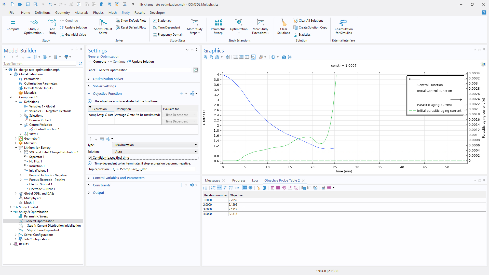Gradient-based optimization for time-dependent problems can now also be used to optimize the final time. This means it is possible to either minimize how long a process takes or let the solver choose the time that gives the best objective value. In the example below, the goal is to minimize the charging time for a lithium-ion battery. The model uses the Control Function feature, which now supports exporting the optimized result as either an analytic function or an interpolation function.
