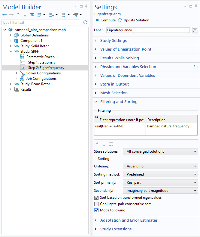 For easier interpretation and identification of potential critical speeds in Campbell diagrams, eigenmodes can now be continuously tracked throughout an analysis. This capability is enabled by the new Mode following option available for eigenfrequency study types. The following tutorial models demonstrate this addition: